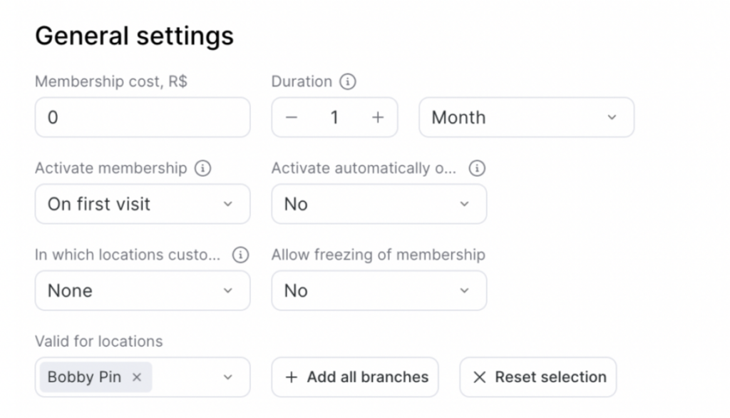 Valid for locations: Specify the locations where the membership is valid. Use the “+ Add all locations” button to quickly add all locations available, or manually select the relevant locations from the drop-down.