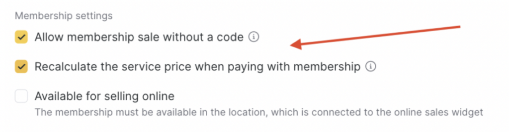 Check the box if you want to allow the sale of a membership without a code. You will be able to create memberships that do not require you to assign a code to them when selling. Such memberships can only be used if a client was specified during the sale. A membership without a code after sale becomes personal and is linked to the number of the client who bought it. It can only be applied to that particular client.
