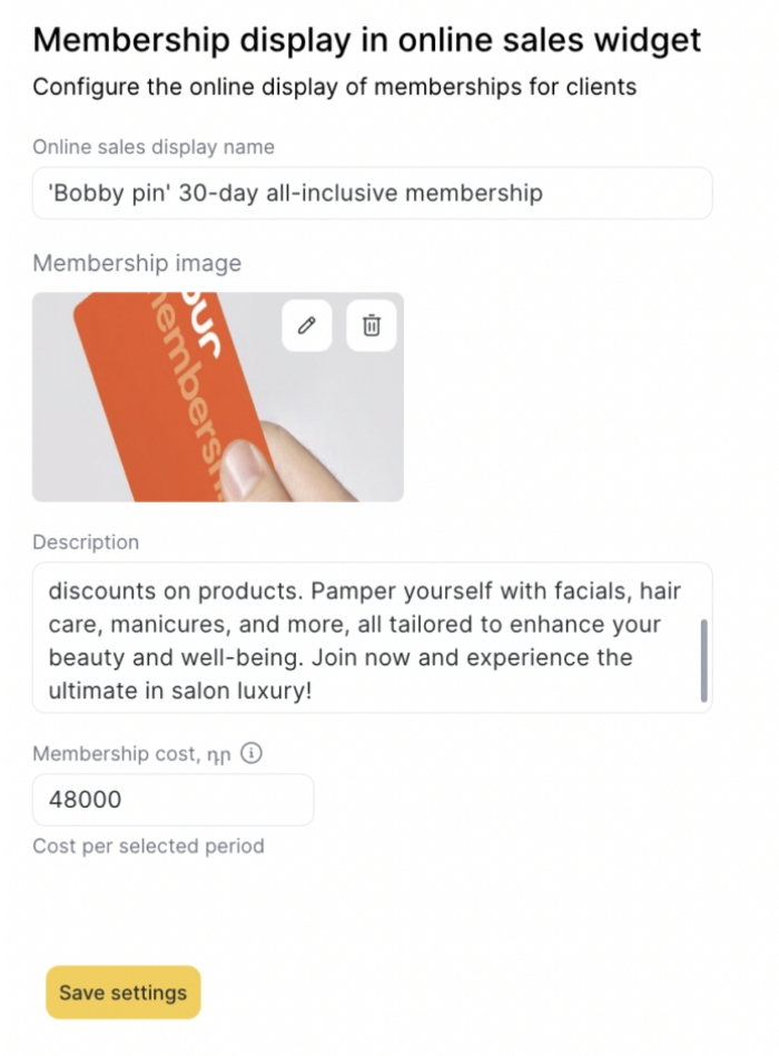 Membership cost: Enter the cost of the membership for the selected period that your clients will see in the online sales widget.