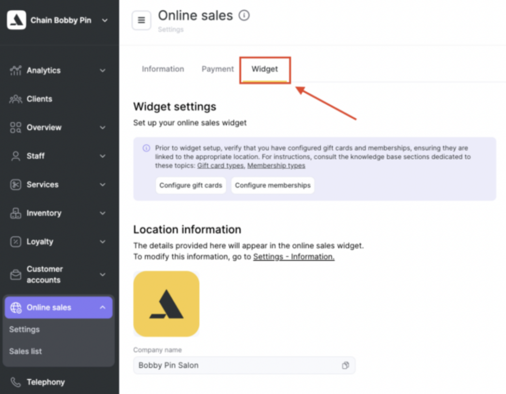 To connect the AltPay payment method to the Altegio system navigate to the chain interface, under the Online Sales section select Settings.