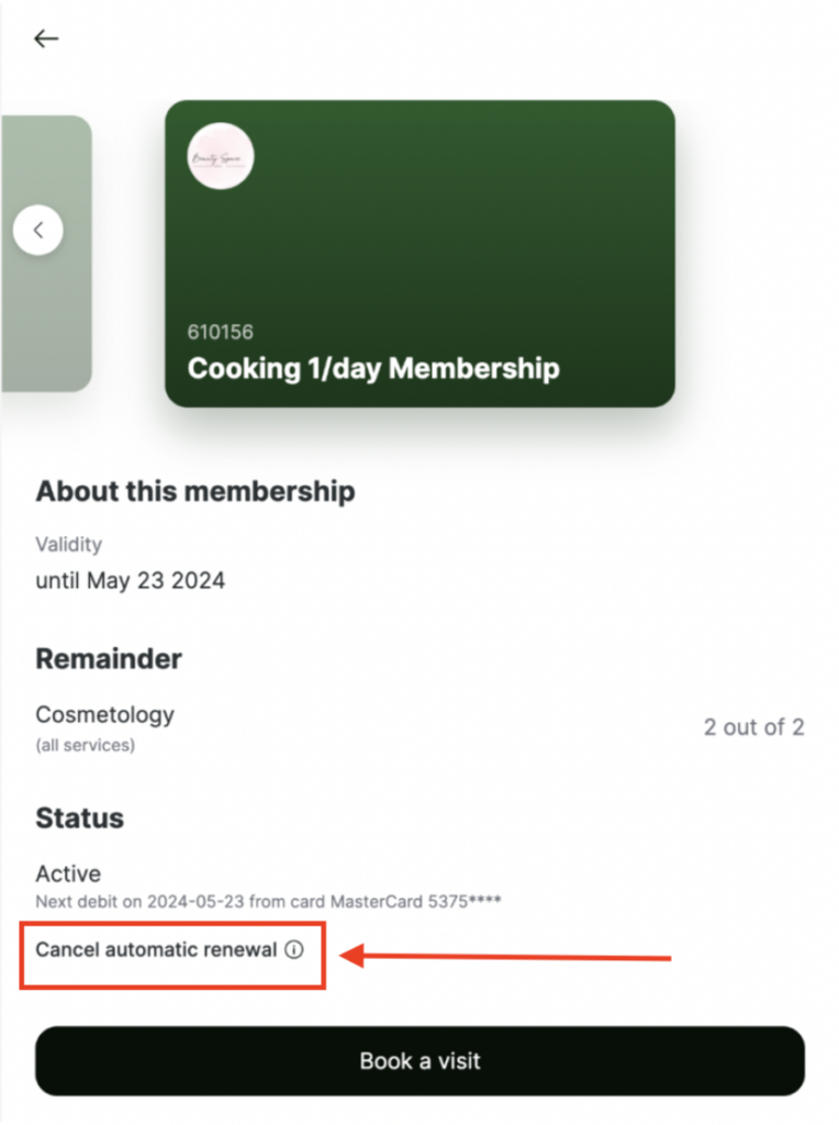 After the purchase, the membership will appear in the client’s widget, where they can see the linked card and cancel the auto-renewal if desired.
