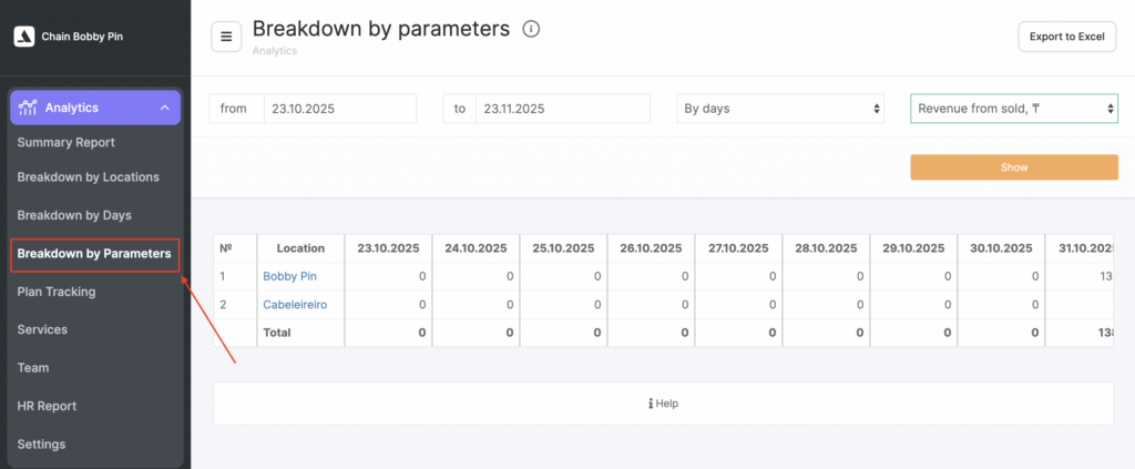 The Breakdown by Parameters report allows you to analyze any single metric across all locations, with day-by-day detail for the selected period.