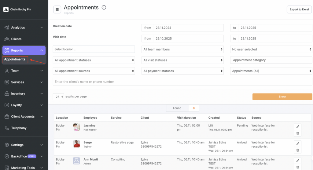 The Reports → Appointments section allows you to view, filter, and manage all appointments created across the chain for the selected period.