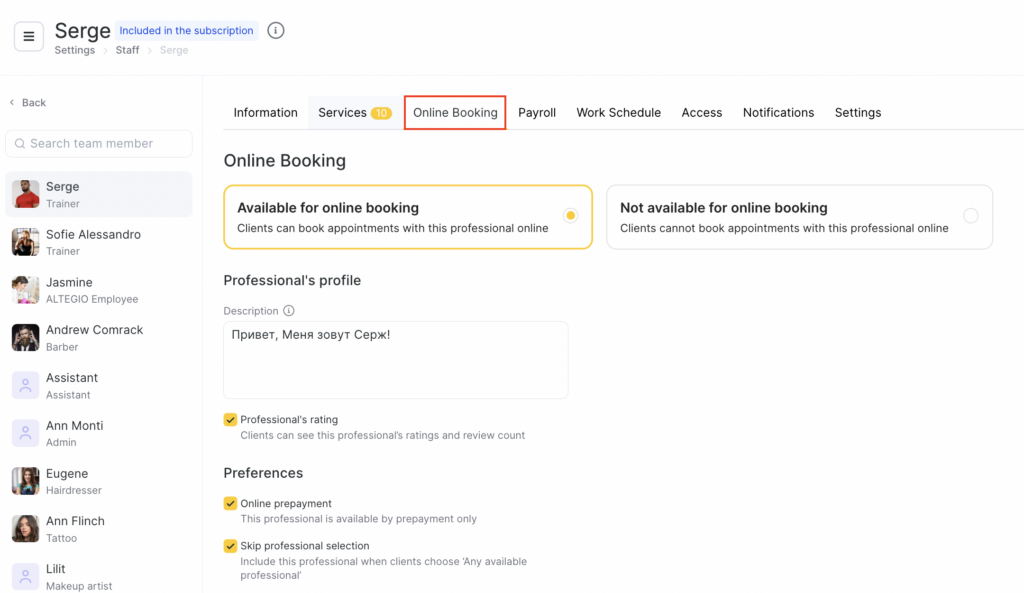 After assigning services to a team member, set up online booking for them. You can configure availability for online booking, description, rating display, online prepayment, skipping team member selection, and available time for bookings.