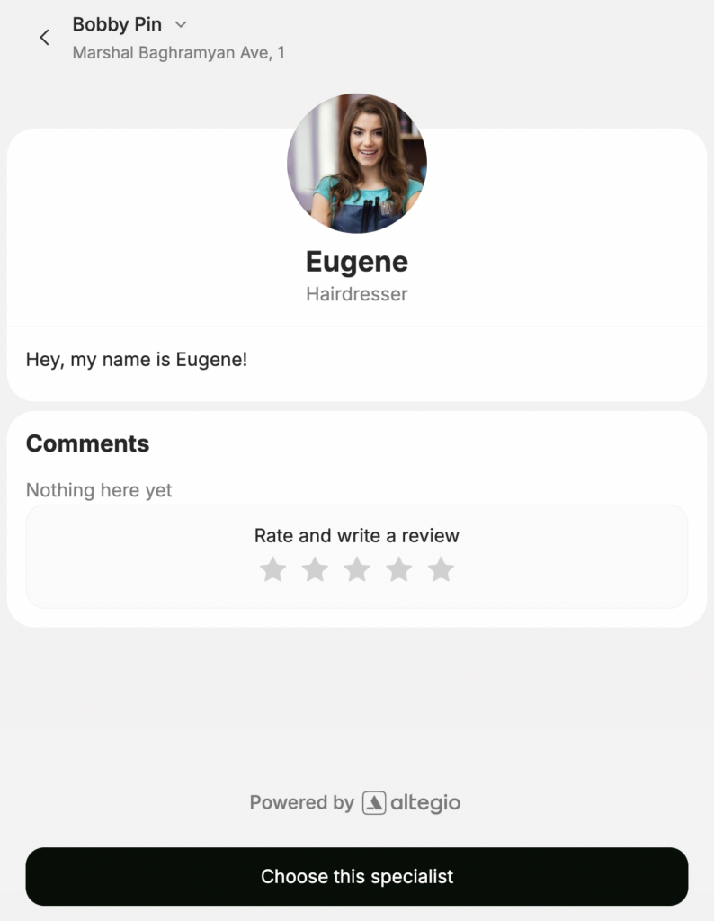 The description opens in the online booking widget when the user clicks the i icon next to the photo. This section usually includes professional experience, education, list of services, specialization, and brief personal details.