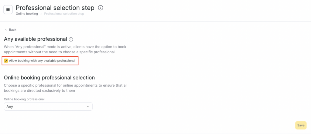 The Any available professional option is displayed in the online booking widget. Allow or forbid online booking with this team member if the client selected the Any available professional option.