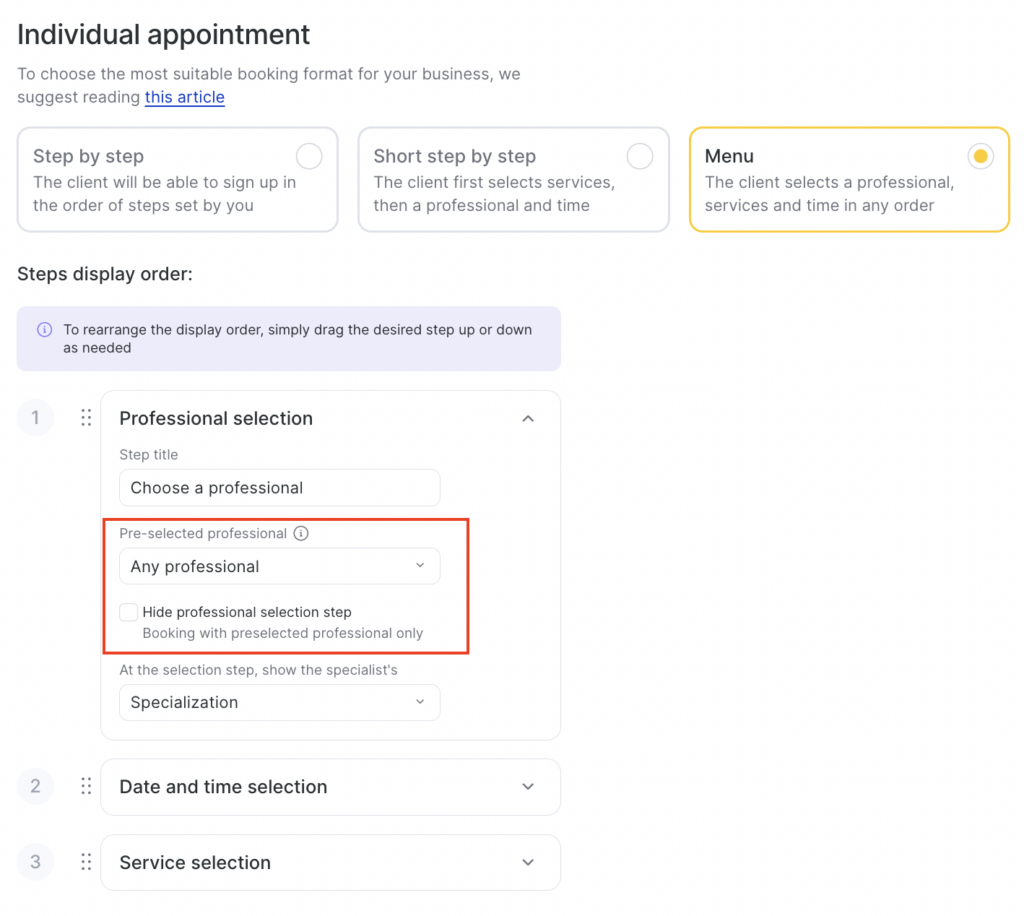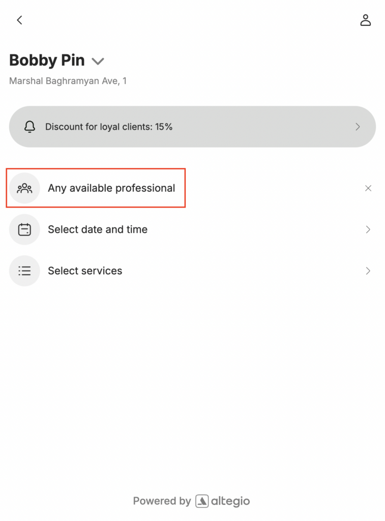 The same mode can be enabled when configuring the booking steps in a separate widget (by setting Any available professional in the Preselected team member field — read more about these settings in the article).