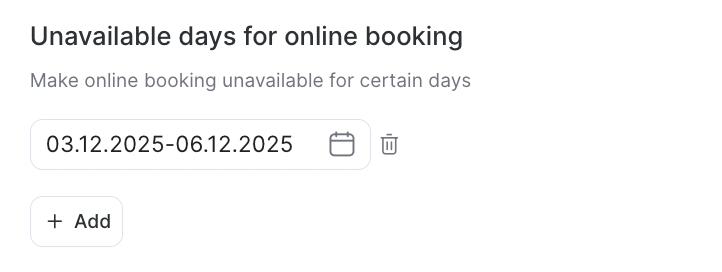You can make online booking with a team member unavailable on specific days and/or periods. For example, if on certain days the team member only accepts clients offline. This helps on pre-holiday days to control booking and schedule clients manually.