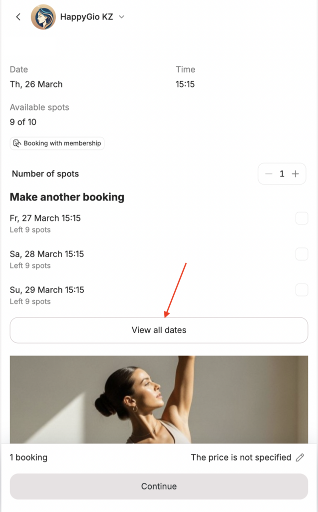 - On the next page, in the Book another block, they can choose additional dates for similar events with the same service and the same team member. If there are more than three suitable events, they can click View all dates to see the rest.
