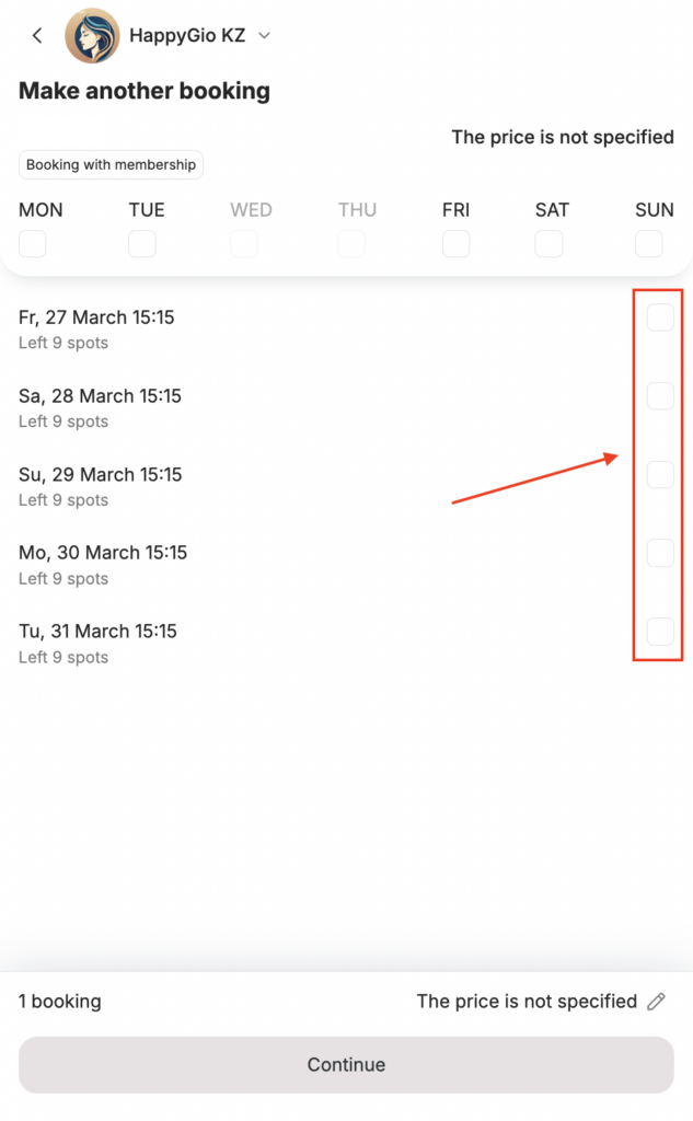 - To select an event, the client checks the box; to unselect it, they clear the box. They can also filter events by a specific day of the week — in this case, all available events for that weekday will be shown. To filter by weekday, the client clicks the event date.