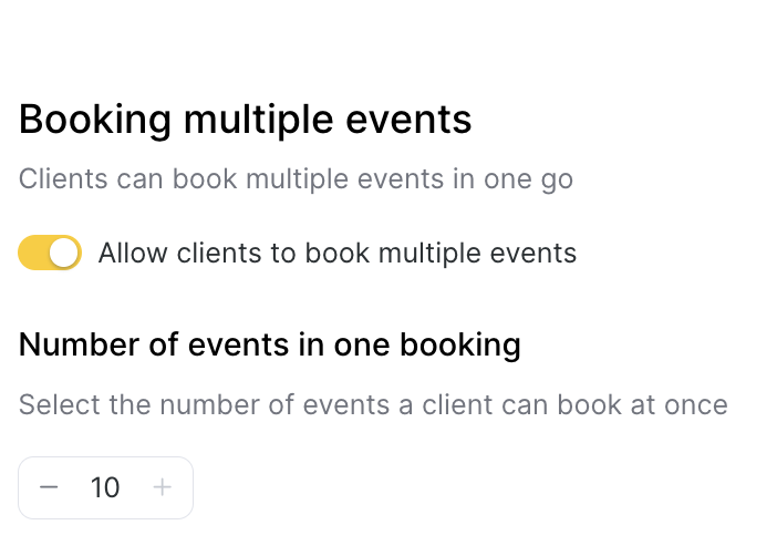 - Select how many events a client can book at once: from 1 to 10. This setting does not affect the number of spots in a single event booking — it only defines the number of events for simultaneous booking. The number of spots in one booking is controlled by a separate appointment journal setting Allow occupying multiple spots within one booking (read more here).