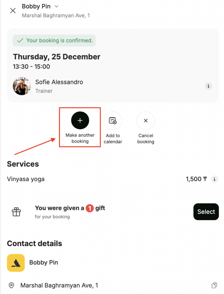 Booking multiple events is not available if online prepayment is enabled for the branch. In this case, the “Book another” block will not be shown.
