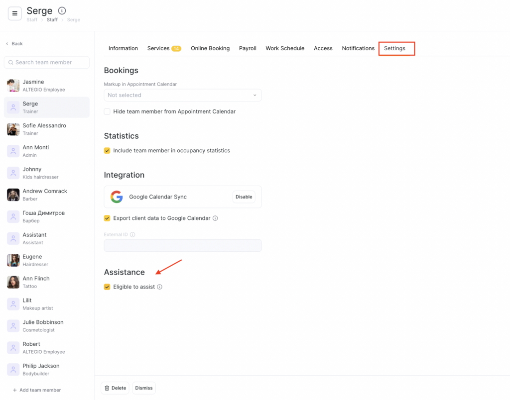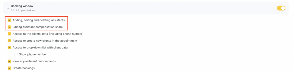 1. Before adding an assistant, make sure the team member has the permissions to add, edit, and remove assistants / change assistants’ reward share enabled. More details on how to configure these permissions in the booking window are provided in the article.