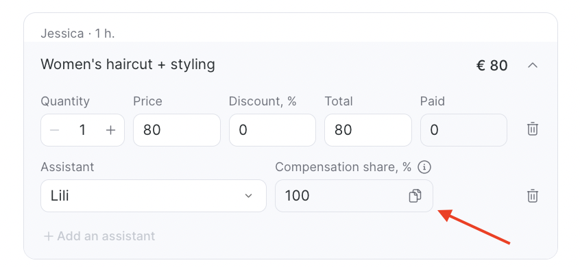 If you set that each assistant receives only a portion of their commission, the system will distribute the commission proportionally among all assistants added to the service. With this setting, you can’t change the reward share in the booking window.