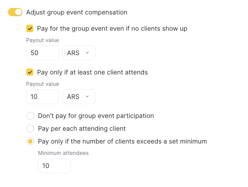 If your team runs group events (for example, workouts, master classes), enable the compensation setting for group events.