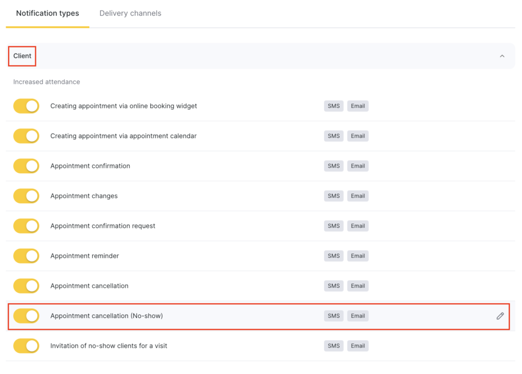 - In the Client > Increased attendance section, select Appointment cancellation (No-show) by clicking the notification name or the pencil icon.