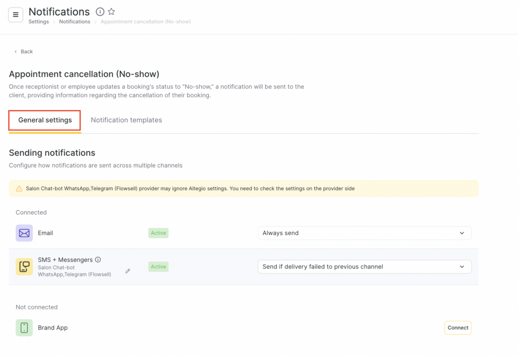 - On the General settings tab, configure how notifications will be sent via multiple channels. For more details about multi-channel notification scenarios, see the article.