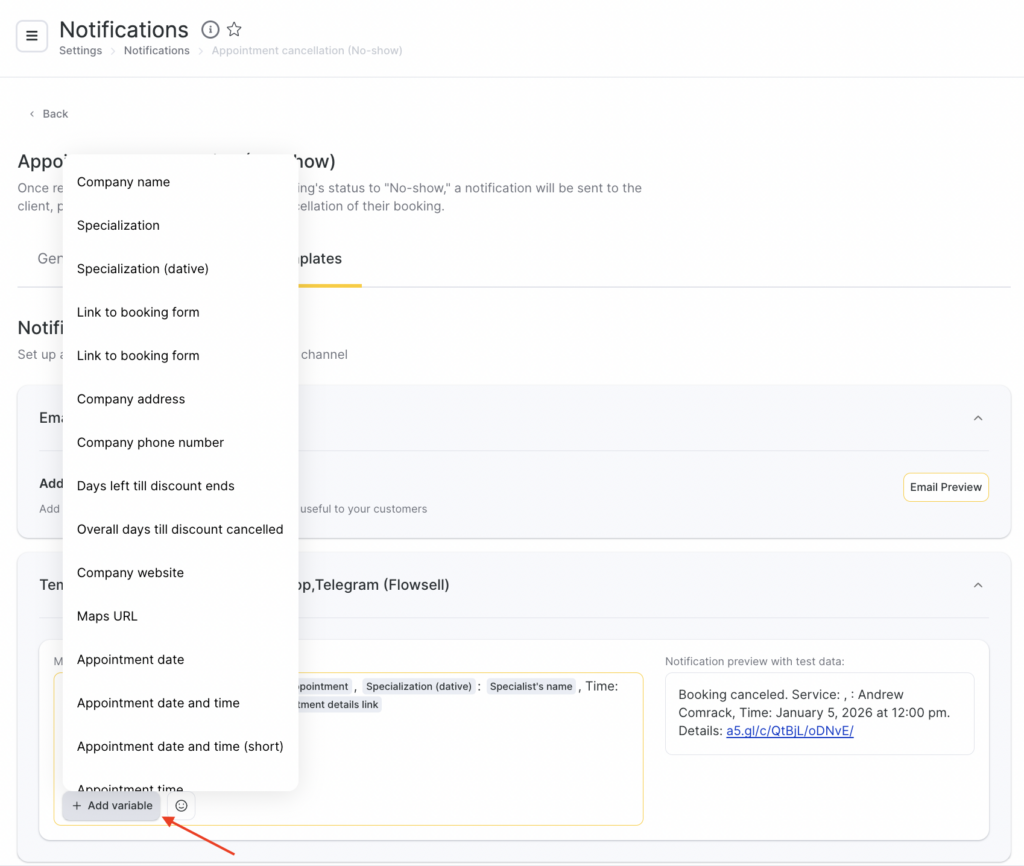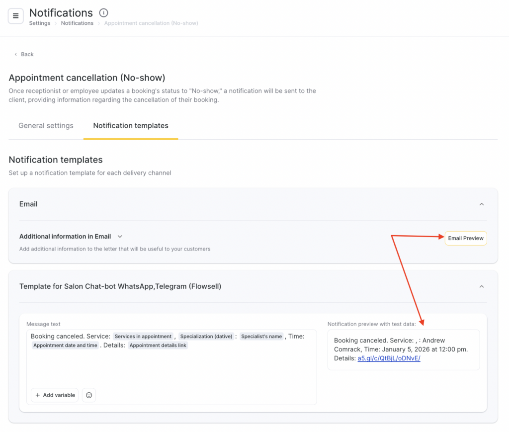 For all notification templates, preview is available — how the message will look when sent to a client, team member, or receptionist, taking variables into account.
