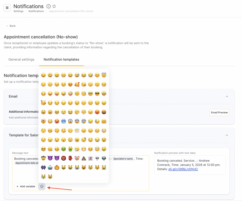 - In SMS notification templates, you can use Emoji. To do this, click the smiley button and choose one from the list or add your own.