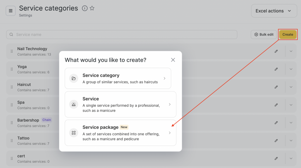 Packages can be sequential or parallel and can include from 2 to 10 services. Read more below in this article about how it works and how to configure it. You can create package services in a location or in the chain interface, configure online booking for them in a location, and also create and edit package appointments in the Appointment Calendar.