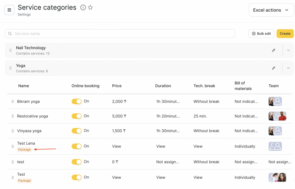 - Polishing fingernails + Manicure + Sellac: a sequential package, performed by one team member (or several). In this case, you can set a price for the entire package at once, for example with a discount — this discount will be visible to clients in online booking.