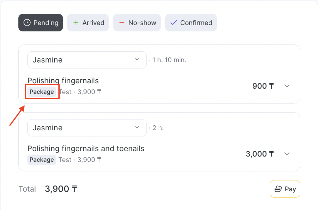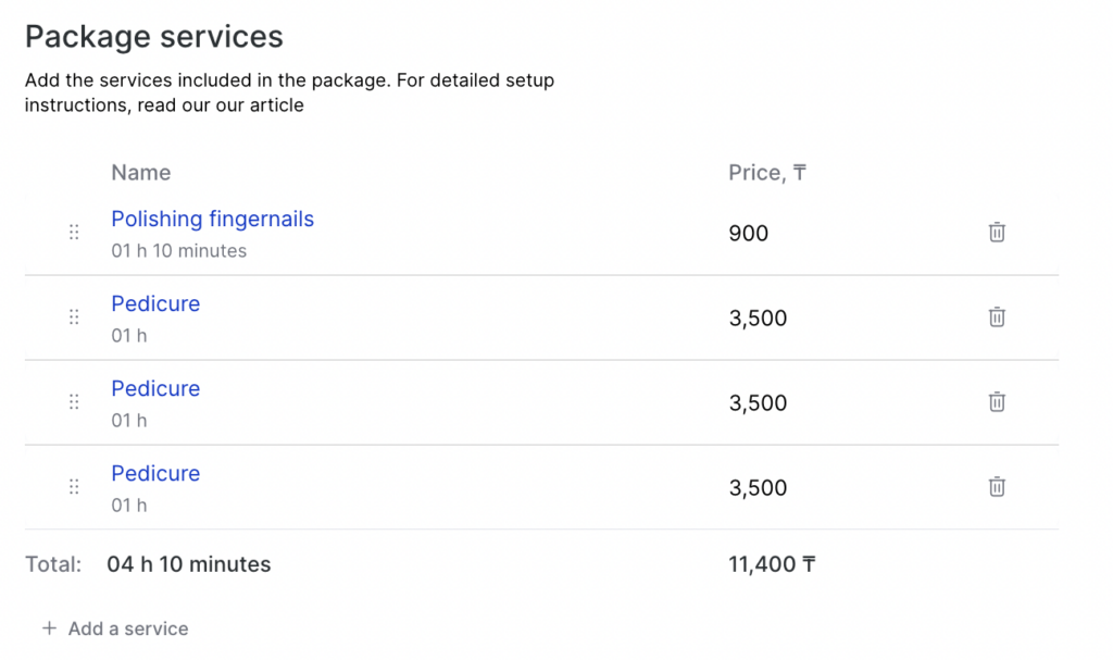 - Specify the package name. For example: Hardware manicure + hardware pedicure.