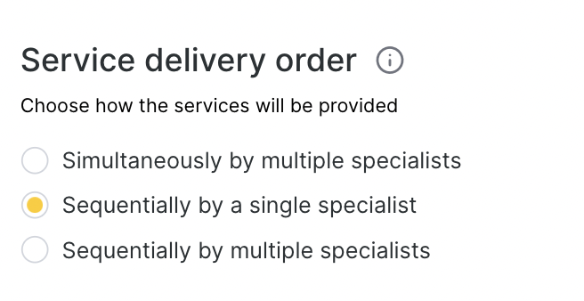 - In the Service delivery order section, select Sequentially by one specialist — if the services must be provided only by one team member. You can also select Sequentially by several specialists if the team members may be different.