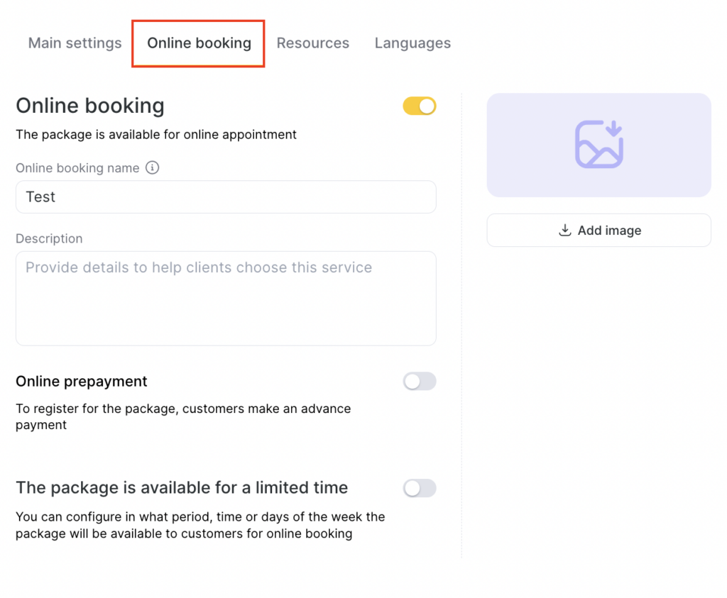 Maximum file size: 12 MB. - To enable online prepayment for the package, turn on the corresponding toggle in the Online prepayment field. When online prepayment is enabled, clients will be able to pay for the package in the online booking widget. For more details on online prepayment settings, see this article.