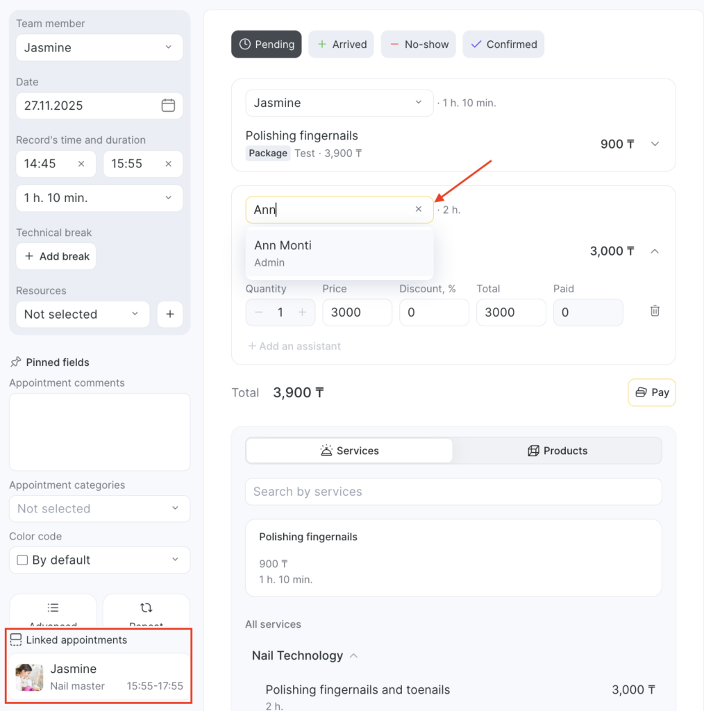 - After adding the package service to the booking, all services included in the package will be added to the appointment. By default, the first service in the package will be assigned to the team member for whom you created the booking. In the lower-left corner, a Linked appointments block will appear with a list of team members providing the services in this package.