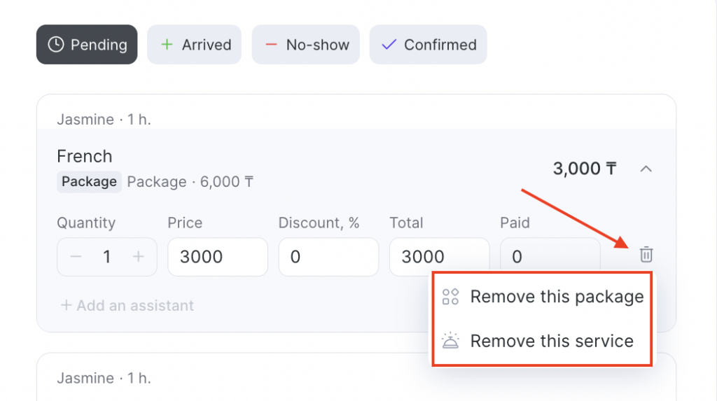 After creating a booking with package services, you can edit and delete it. You can also add separate services to the booking that are not part of the package, create bookings with several packages in the calendar, and delete both individual services and the entire package from the booking.