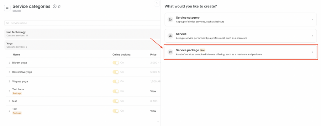 Packages can be sequential or parallel and can include from 2 to 10 services. Read more below in this article about how it works and how to configure it. You can create package services in a location or in the chain interface, configure online booking for them in a location, and also create and edit package appointments in the Appointment Calendar.