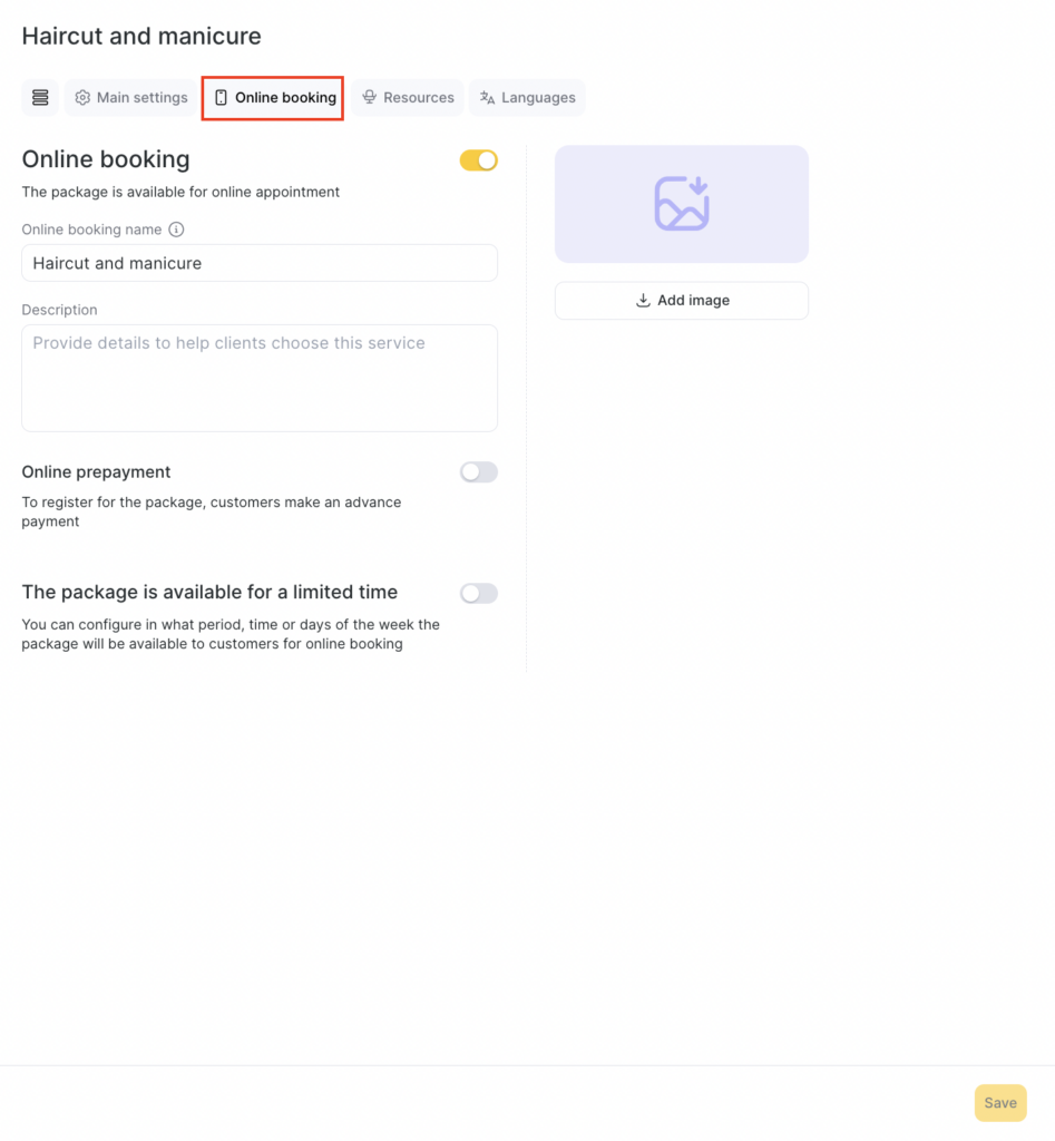 Maximum file size: 12 MB. - To enable online prepayment for the package, turn on the corresponding toggle in the Online prepayment field. When online prepayment is enabled, clients will be able to pay for the package in the online booking widget. For more details on online prepayment settings, see this article.