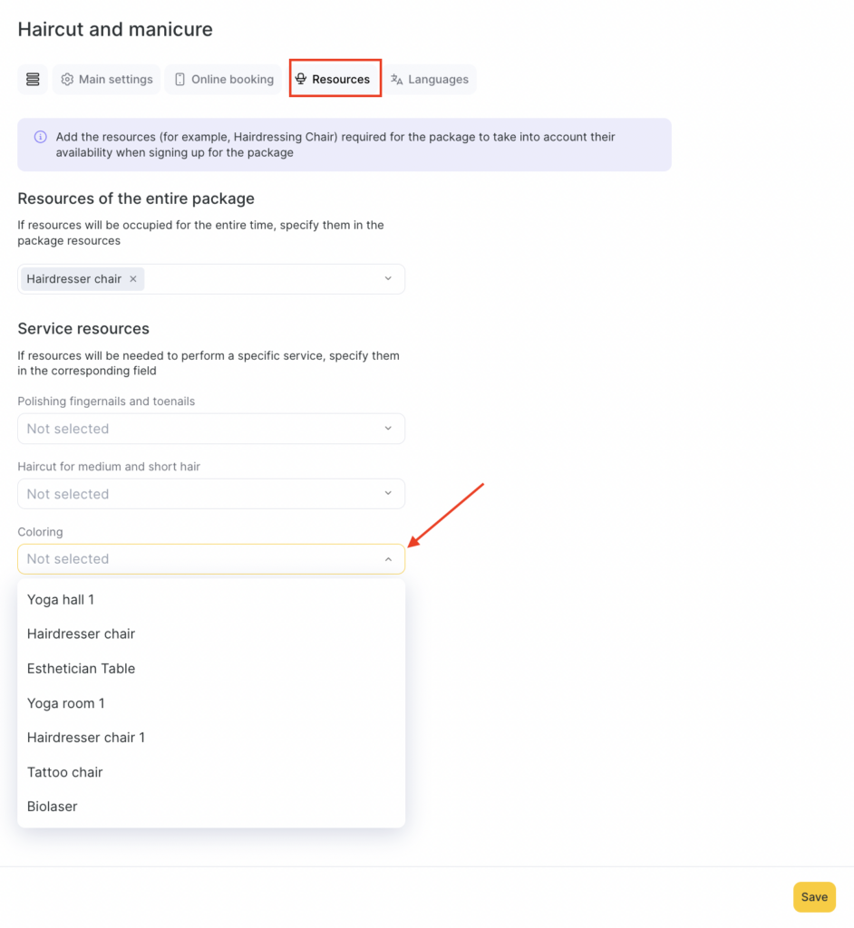 - In the Resources for the entire package block, you can add resources not for individual services but for the whole package. For information on how to create a new resource, see the relevant article.