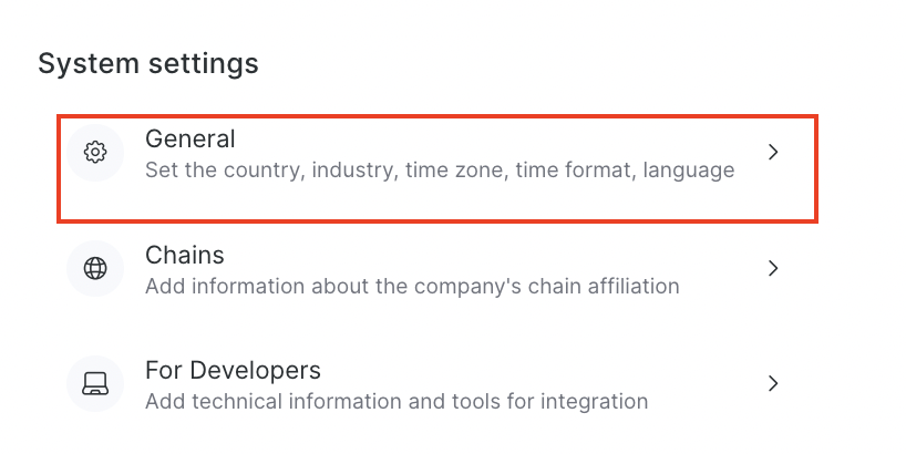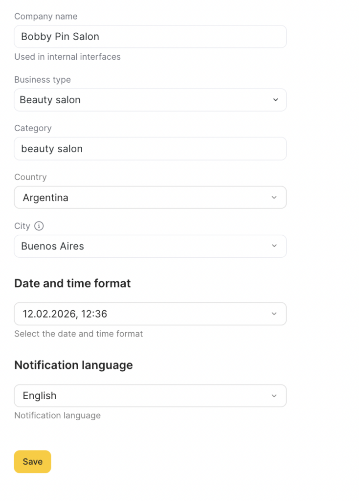 The System settings section is used for the basic account parameters: location, display formats, and the language of client notifications. These settings help the system display data correctly in the interface and send messages to clients in the required format.