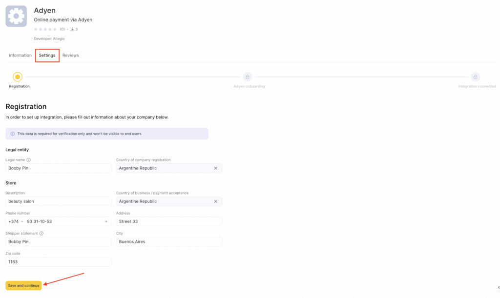 If the link expires, you can request/generate a new link from the same integration screen (Altegio will provide a way to return to onboarding).Click Go to Adyen onboarding to open the hosted onboarding flow.