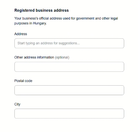 - Legal business details (legal name, registration country, business address, phone, etc.).