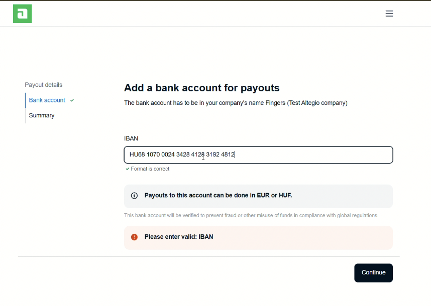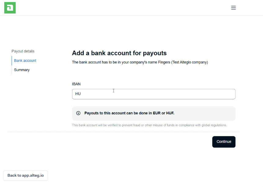 Additionally, you may be prompted to fill in an IBAN field and a note about supported payout currencies.