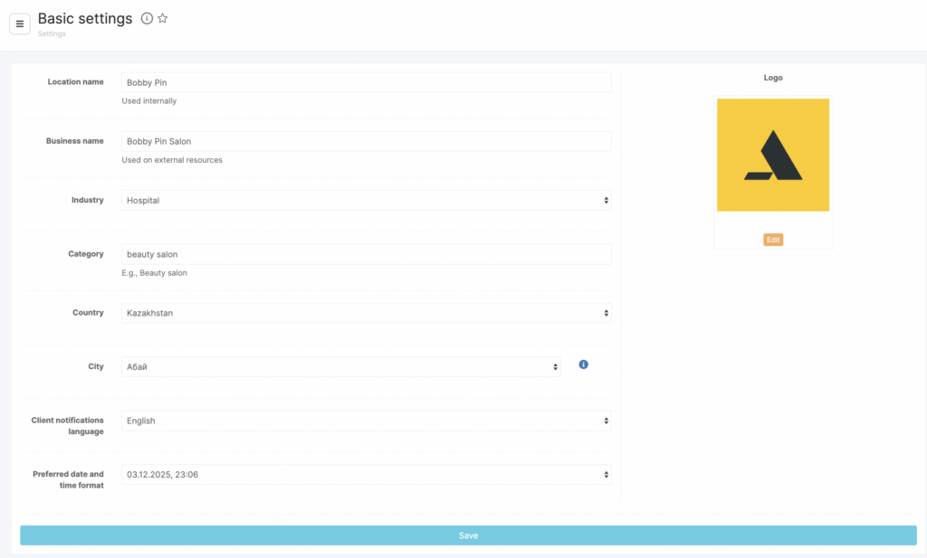 3. Select the city. This setting affects how company information is placed on directory websites and reflects the branch structure in the online booking widget. The branch time also depends on this setting.