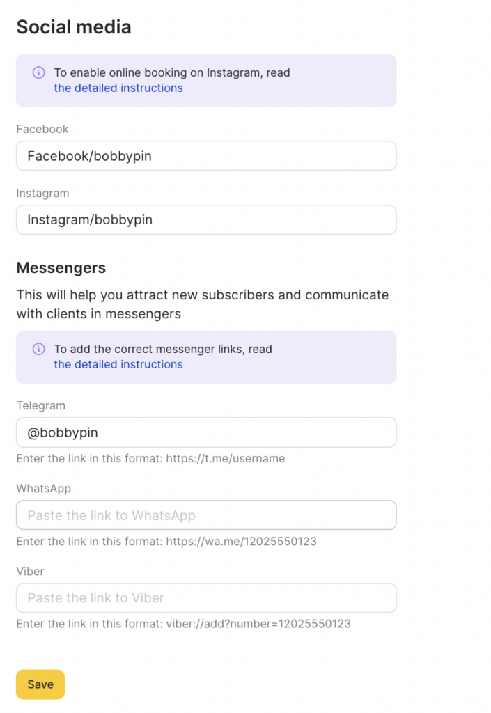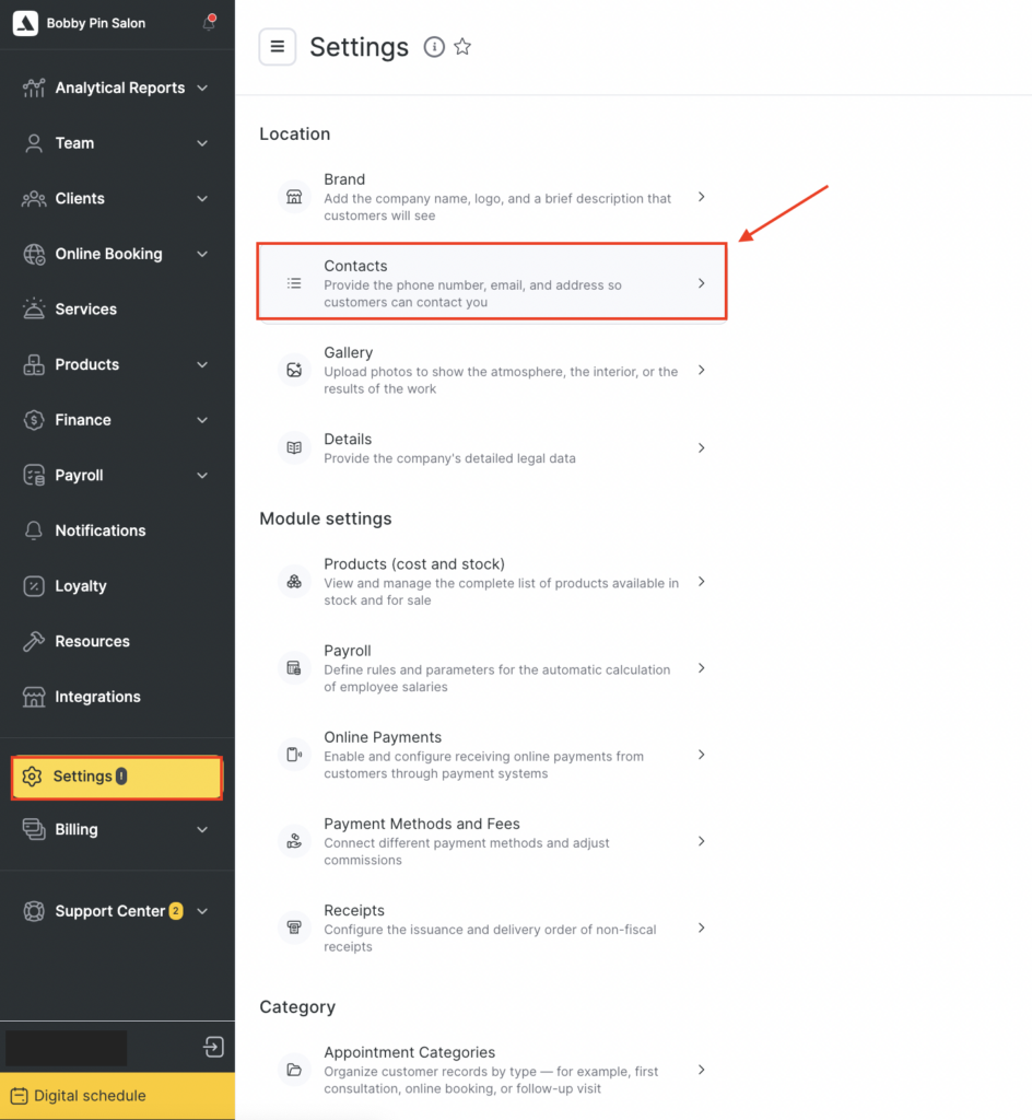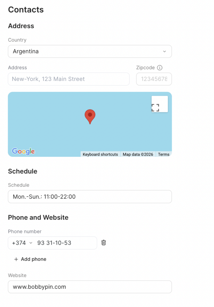 Contact details are displayed in the online booking widget on the About page, Google Maps, Instagram and in the list of locations.