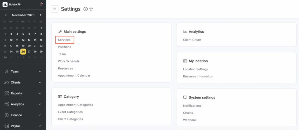 To view existing services, click the folder with the category name. A dropdown list will open where you can edit services, delete them, and add new ones.