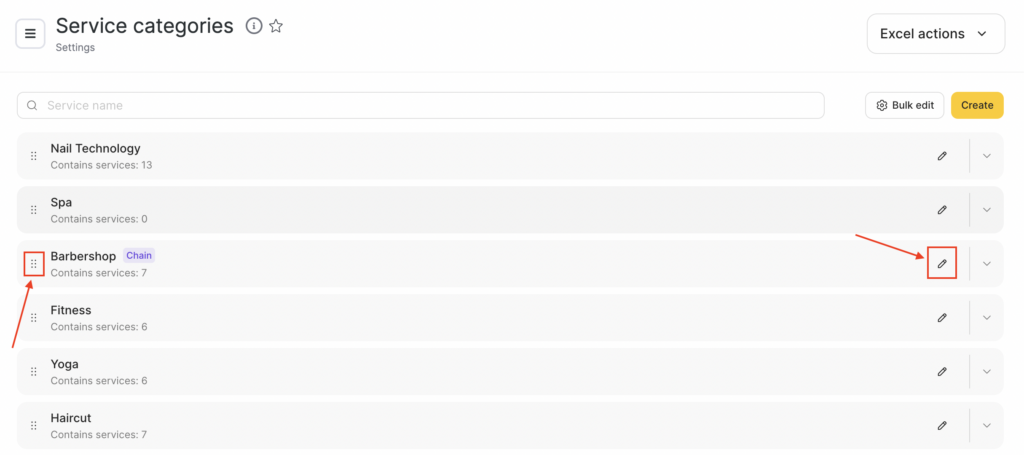 There are controls to the right and left of the category name; use them to edit the category and move it within the list.