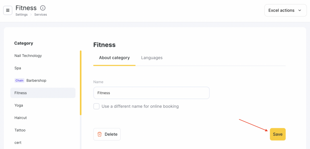 In the “Name for online booking” field, enter the category name that clients will see when booking online.