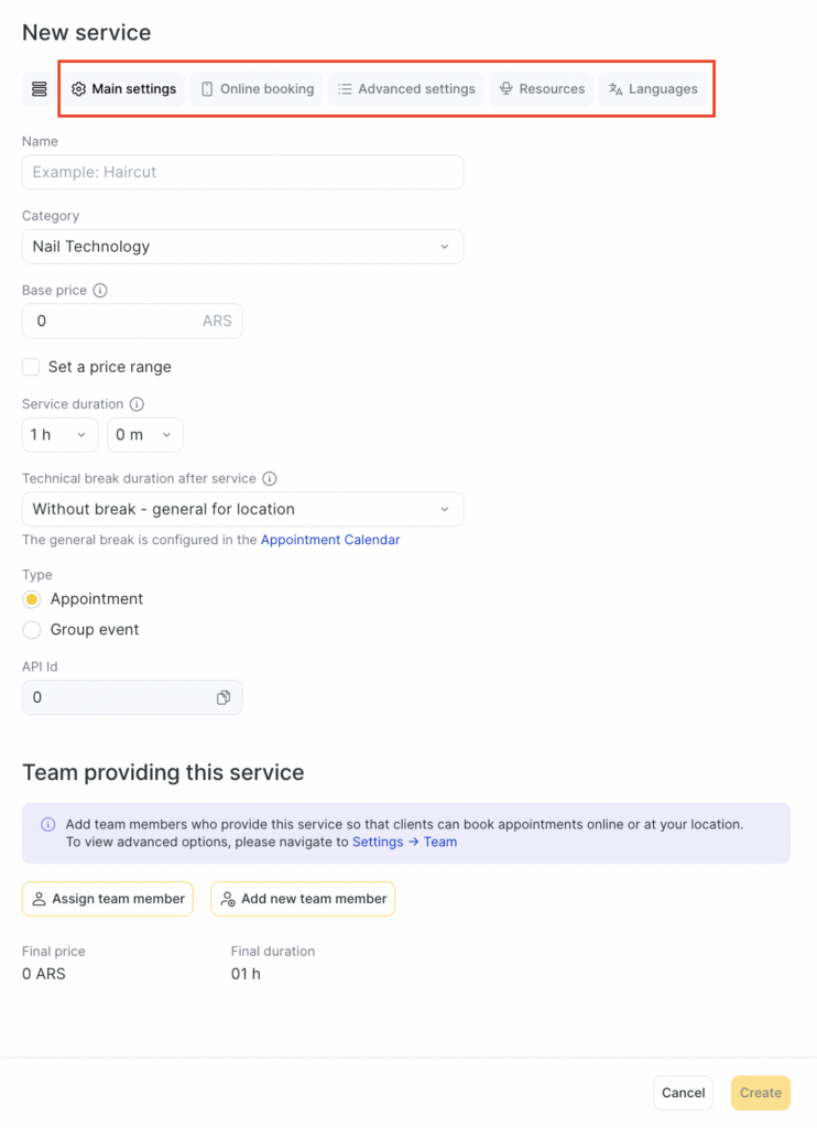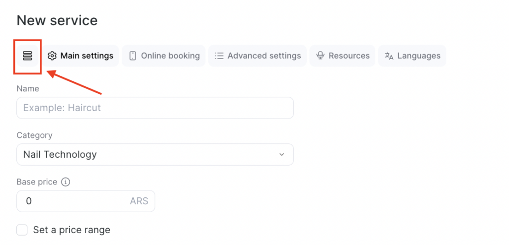 - Select the Category of the service, for example, Haircuts. By default, the category in which you are creating the service will be selected.