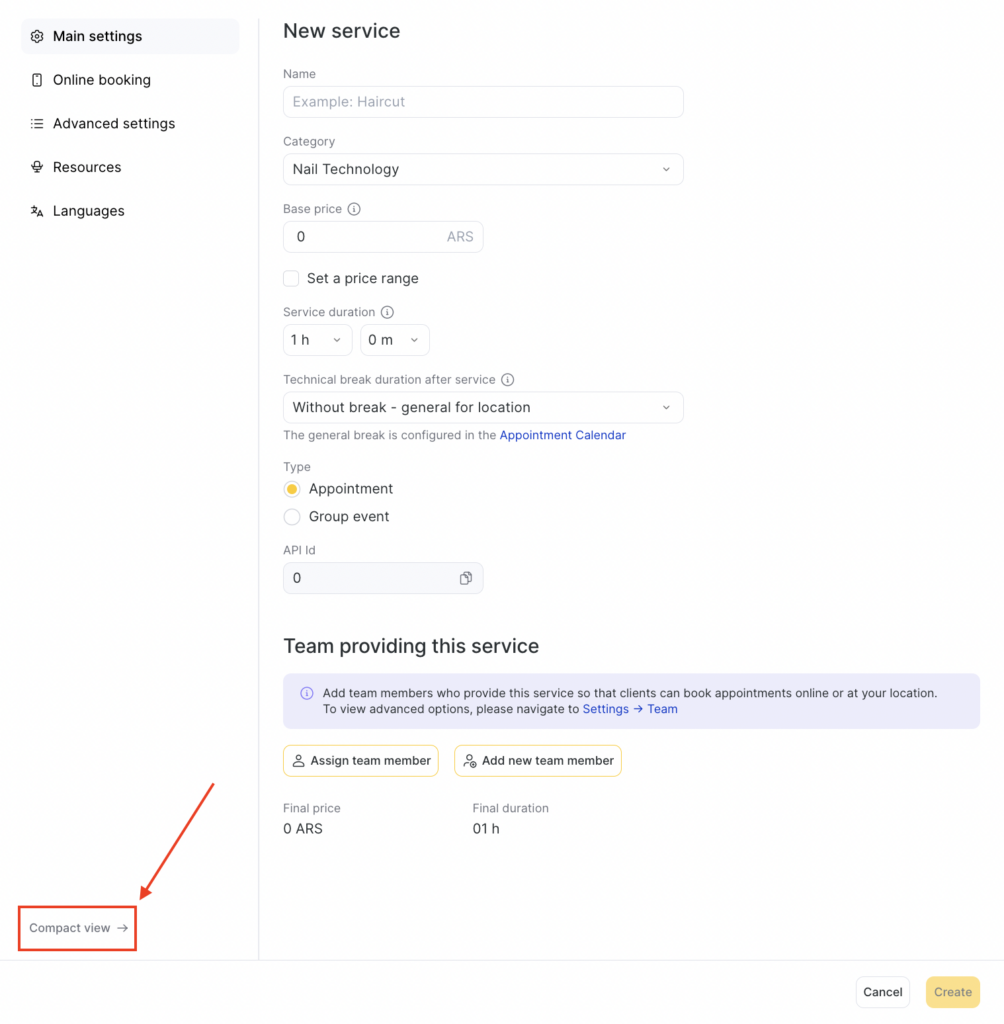 - Specify the name for online booking. This is the service name that clients will see when booking online. If you leave the field empty, the main service name will be used.