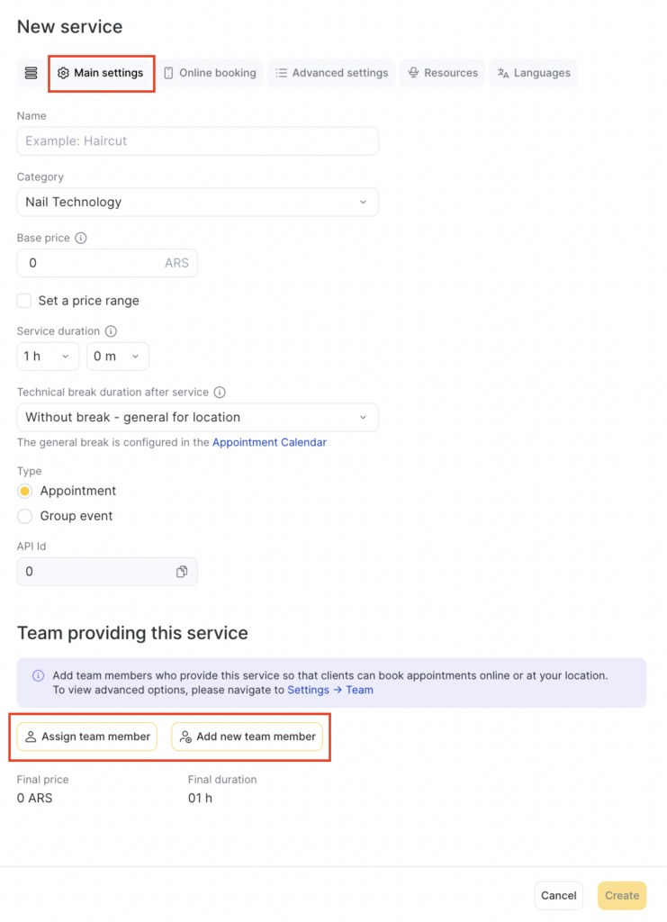 - To add a team member to a service, go to the Main settings tab in the service settings.