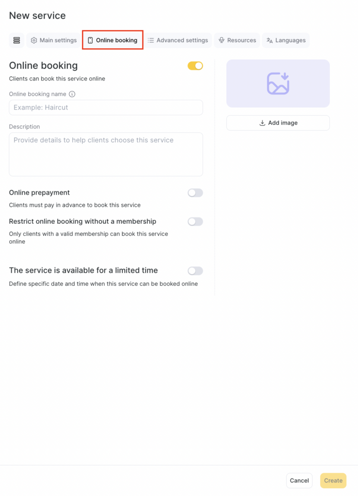 - To enable online prepayment, switch on the corresponding toggle in the Online prepayment field. When online prepayment is enabled, clients will be able to pay for the service in the online booking widget.