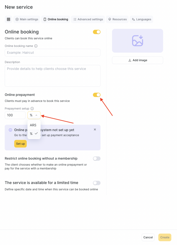 If mandatory or optional payment is enabled in your location, when setting up individual services you can choose to either enable online prepayment or forbid online booking without membership — you cannot enable both settings at the same time. If you plan to use both options, you can create duplicate services, where one service has online prepayment enabled and the other is booked by membership.For example, individual service categories like Room rental and Room rental by membership, group events like Yoga and Yoga by membership, etc.