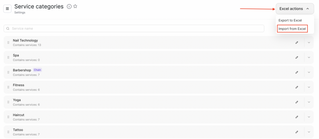 - In the top-right corner, click Excel actions and select Import from Excel.
