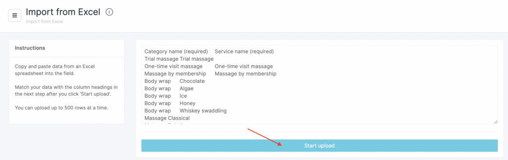 4. Paste the data from the Excel table into the input field and click Import. You can import no more than 500 rows of the table at a time.