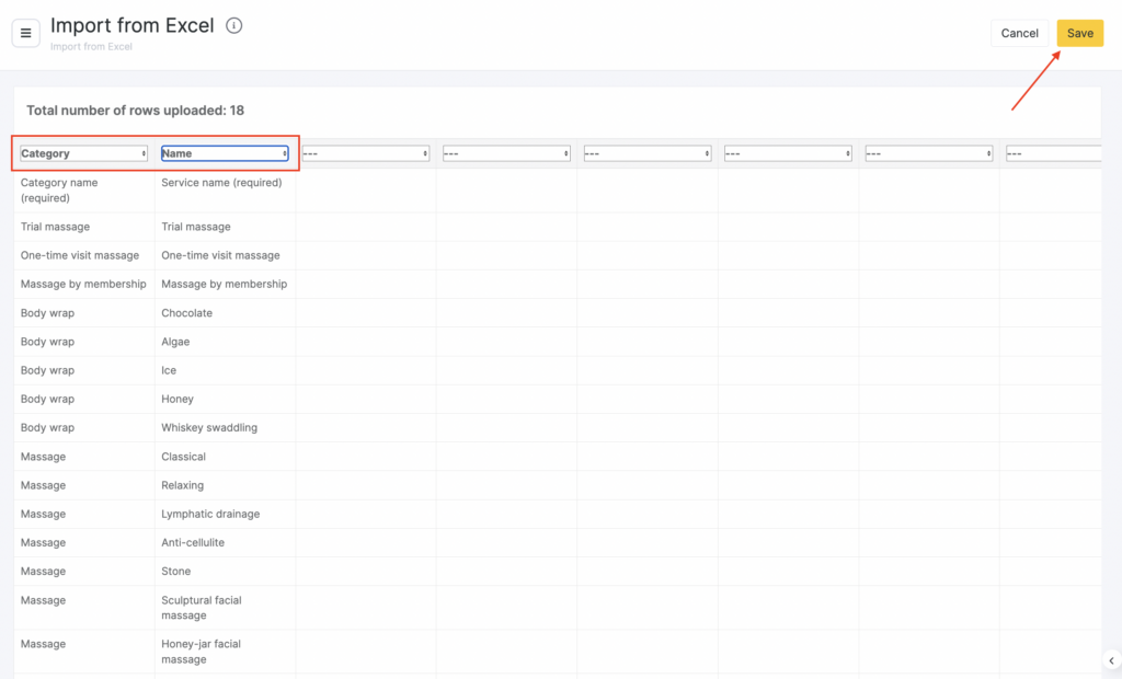 You can import no more than 500 rows of the table at a time.If you are importing services exported from another location, you will need to delete the ID columns in the Excel file before importing.